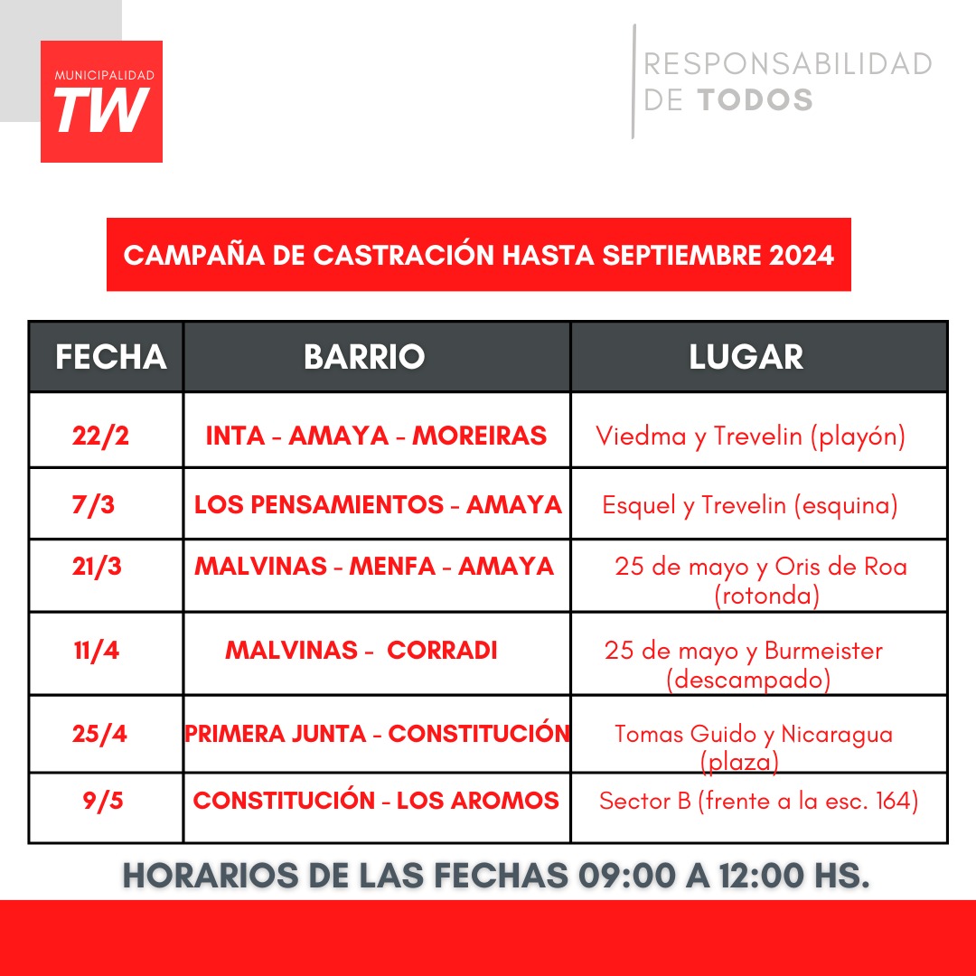 AGENDA DE LA CAMPAÑA DE CASTRACION DE LA MUNICIPALIDAD DE TRELEW HASTA EL MES DE SEPTIEMBRE DE 2024